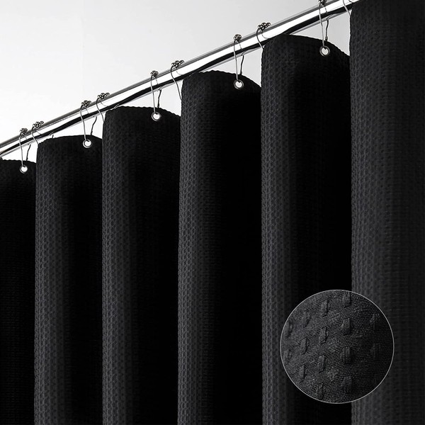 - 🚿【Dimensions】54W * 78H inch; 256GSM (Gram Per Square Meter), about 1.1 pounds heavier than normal 90GSM fabric shower curtains; 8 rust-resistant grommets that fit most standard shower hooks or rings. Package includes 1 Black Waffle Shower Curtain and 8 Plastic Hooks.