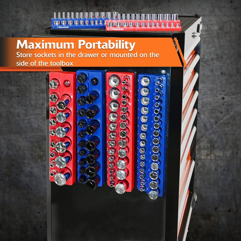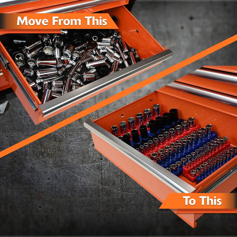 - Socket organizers are color-coded (Red for SAE sockets and Blue for metric socket); socket sizes clearly printed for easy identification and selection.