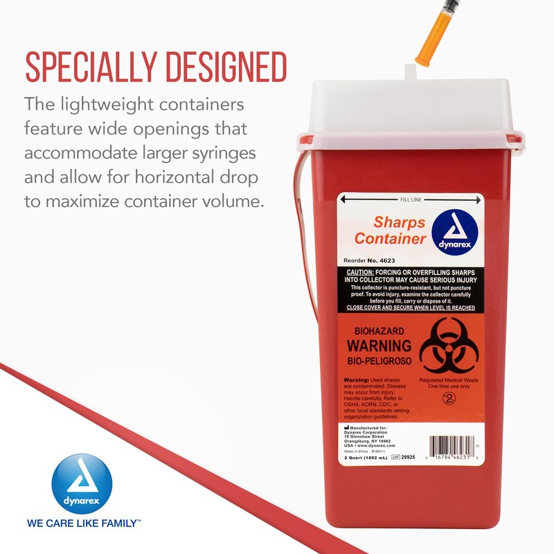 - PUNCTURE-RESISTANT THERMOPLASTIC: The Dynarex Sharps Container is made from rigid, puncture-resistant thermoplastic. This helps to prevent hypodermic needlestick injuries and stops sharp needles from breaking through the wall of the container.