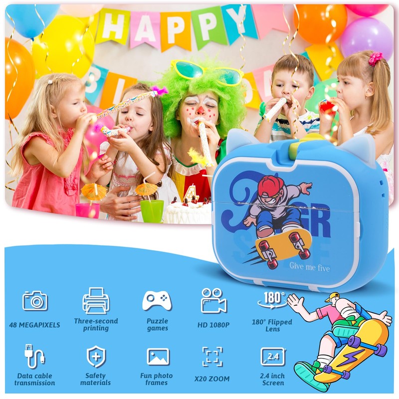 DYNASONIC Instant Kids Camera (2nd Generation Skater). Digital photo and video camera. 48MP. 2,5k UHD. SD 32GB, 4 digital printing paper. Gift for children from 3 to 14 years old
