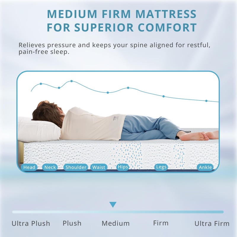 • SUPPORTIVE MEDIUM FIRM STRUCTURE: Thoughtfully designed with a balanced combination of comfort and support, the mattress features high-density base foam and responsive memory foam layers. This structure promotes healthy spinal alignment, relieves pressure points, and delivers medium firmness that suits a wide range of sleepers for restful, undisturbed sleep.