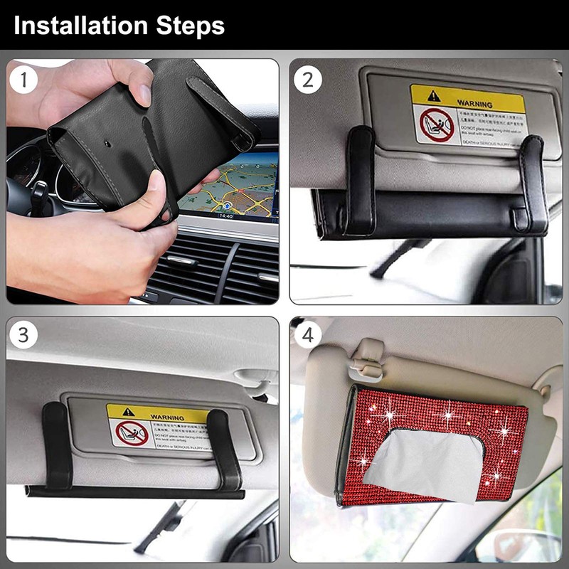 - Easy to install: Rhinestone visor tissue mask box: There is 2 hooks behind, to make it clip on the vissor. Cute hook clip: Peel off the backside paper, to stick it on wherever you like.