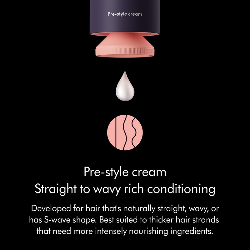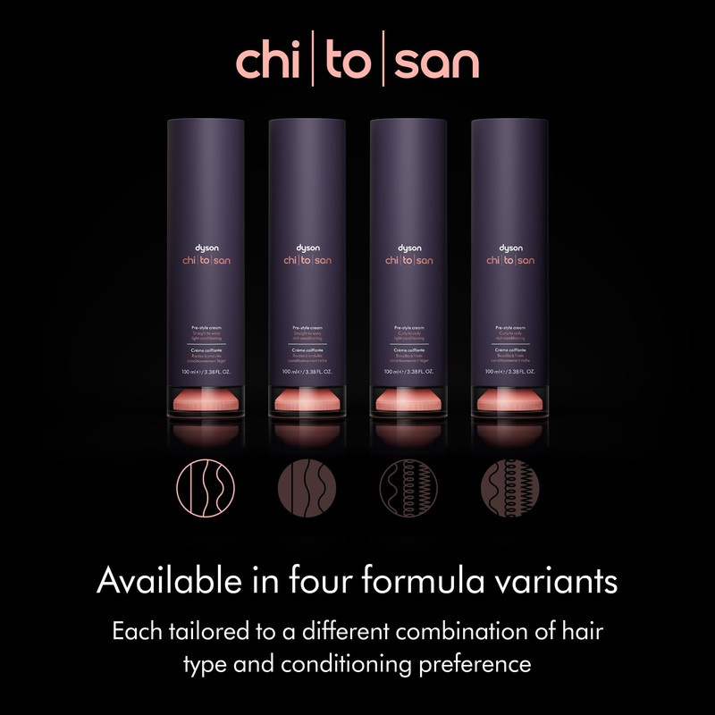 - Dyson Chitosan Pre-style cream Straight to Wavy, Rich Conditioning is developed for hair that's naturally straight, wavy, or has S-wave shape. Best suited to thicker hair strands that need more intensely nourishing ingredients.
