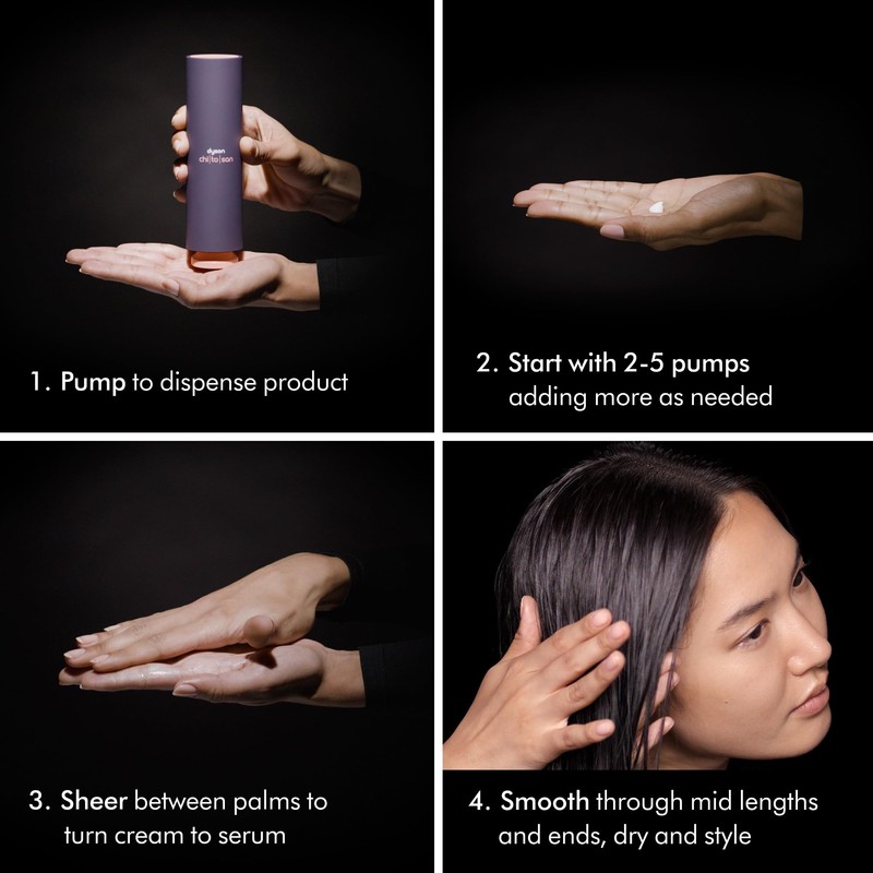 - Use on towel-dried hair before drying and styling. Pump to dispense product. Start with 2-5 pumps, adding more as needed. Sheer between palms. Smooth through mid-lengths and ends. Dry and style as desired with your favorite hair tool. Finish with Dyson Chitosan Post-styling Serum for maximum retention.