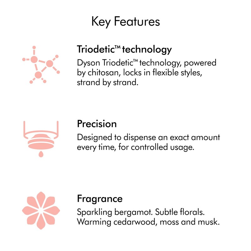 - Dyson Triodetic technology Nourishes individual hairs, while locking in styles, for long-lasting hold with a lightweight natural feel.