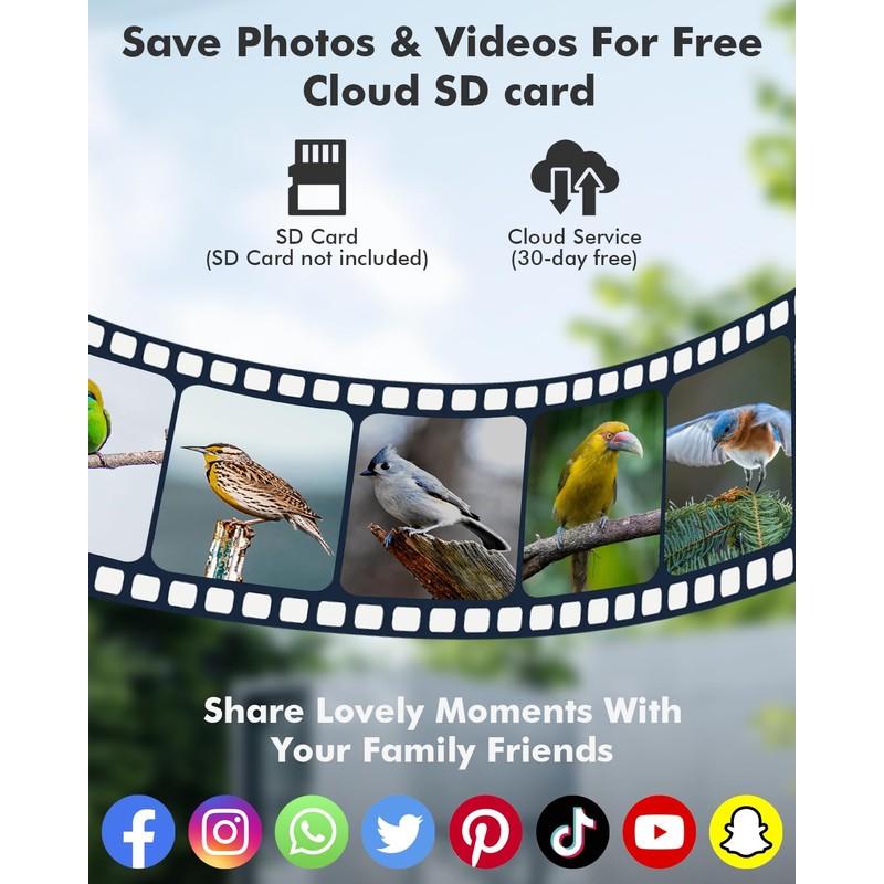- 🐦Fun and Easy Way to Birdwatch: You can watch the feathered tourists in real time wherever you are. Don't worry about missing any birds, once birds start to visit, the bird feeder camera will capture vibrant video that pick up every cute head tilt and peep. You can discover the bird species in backyard with your family and friends.
