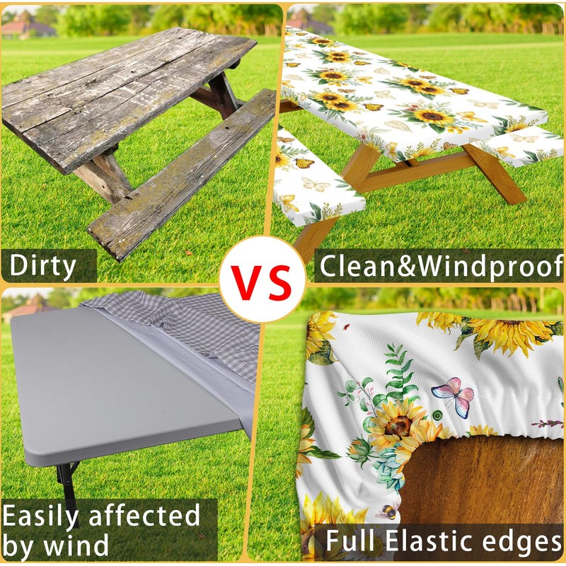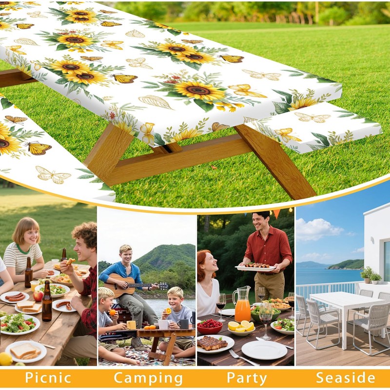 DZLGC Sunflowers Table Cover with Bench Covers Waterproof Windproof Elastic Fitted Outdoor Camping RV Tablecloths with Drawstring Bag Reusable Rectangle Rectangle Tables and Seats Cover 30X72IN