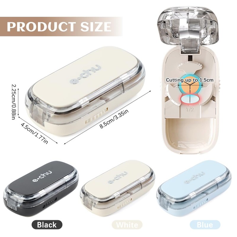 - Hochwertige Materialien: Ein Teil der Box besteht aus lebensmittelechtem ABS Material, das direkt mit Medikamenten in Kontakt kommen kann. Klinge aus rostfreiem Stahl, verschleißfest und korrosionsbeständig, präzise und scharf, sauberes Schneiden