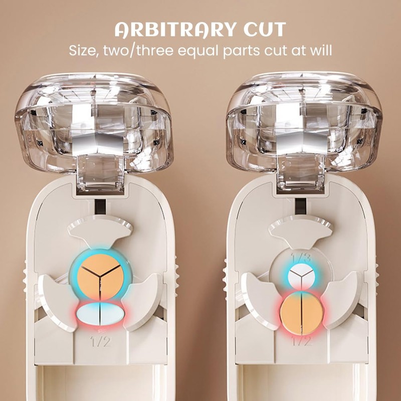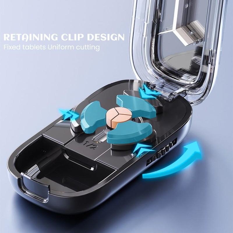 Der Pillenschneider ist mit einem verstellbaren Drehknopf ausgestattet, mit dem Sie die Position durch Drehen der Zahnräder je nach Größe der benötigten Tabletten ändern können. Die Tabletten werden dann in das Gerät gelegt und in Hälften oder Viertel geschnitten, um das Schlucken zu erleichtern