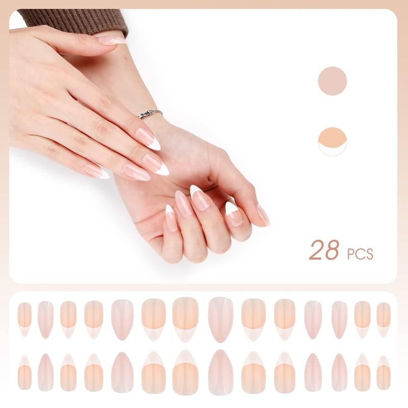 E&A Press On Nails - French Tips| UV Finish Short Pointed Almond Shape, Reusable Pastel False Nails, Acrylic Fake Nail Tips Press On Manicure Kit - 28PCS