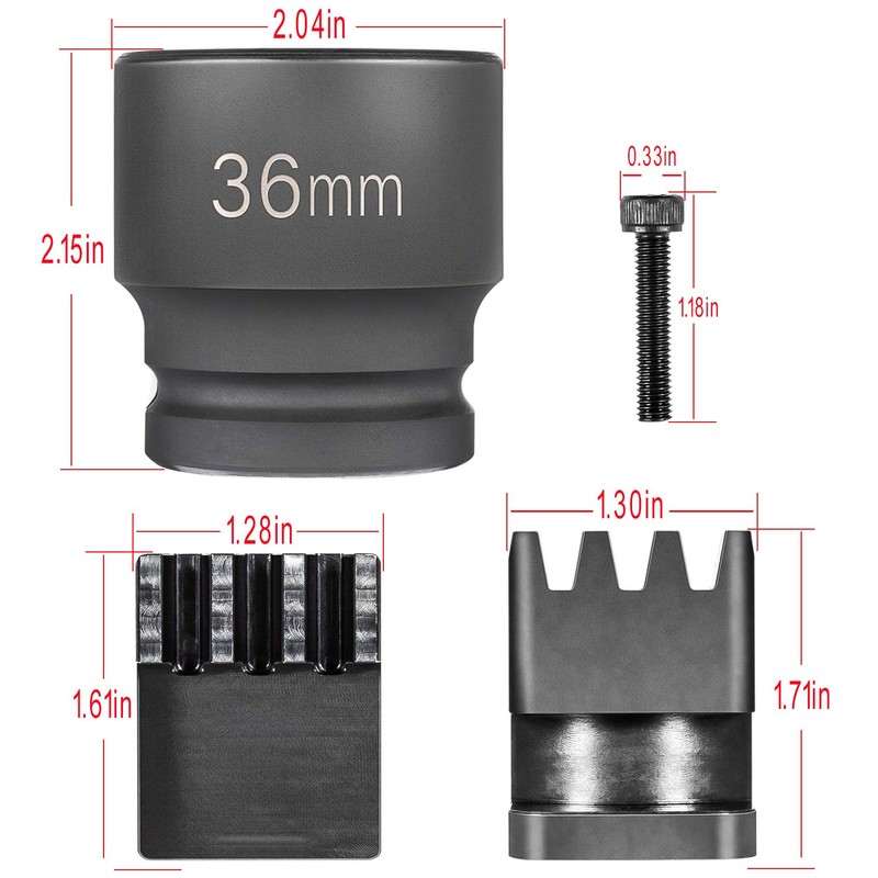 - 36mm Socket -- Use 36mm 12 point socket with 3/4" square drive to remove harmonic balancer bolt and re-torque on installation. 36mm 12 point socket can also be used on axle.