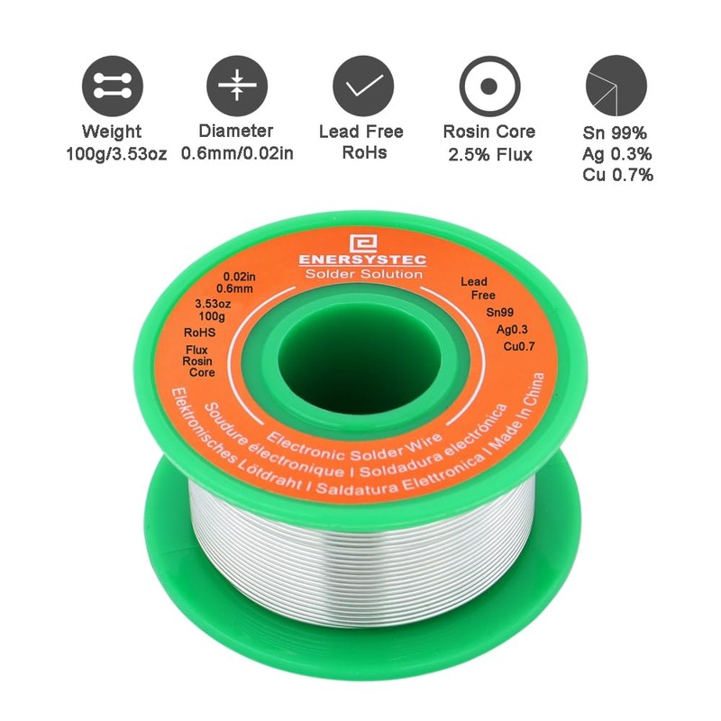 E ENERSYSTEC Thin Solder Wire 0.6mm Lead Free Electronic Solder Wire Rosin Core Sn99 Ag0.3 Cu0.7 Alloy Solder Wire Activated Electrical Soldering 100g 3.53oz Fine Diameter 0.02in Gauge No Lead