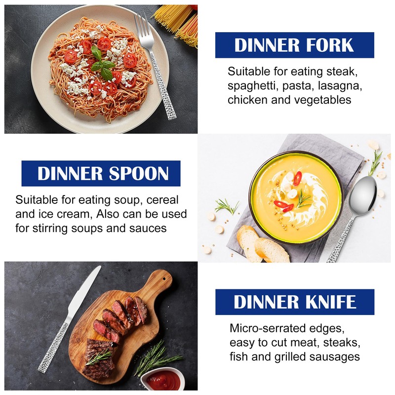 - ELEGANT APPEARANCE: Stylish hammered design on the front side of each square handles; Mirror polishing makes the silverware more shiny; Fashionable and elegant appearance can be paired with different styles of dining tables to create an elegant and luxurious dining atmosphere to improve your dining experience of your family and dinner guest