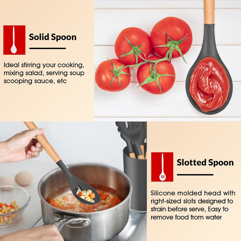 - EASY TO USE & STORAGE - With its neutral grey and natural wood construction, It pairs well with just about any color scheme, Handy and versatile for all your cooking and baking needs, Each handle has a hanging loop for easy storage, Keep your drawer space clear of clutter, Ideal gift for Christmas, Thanksgiving, housewarming