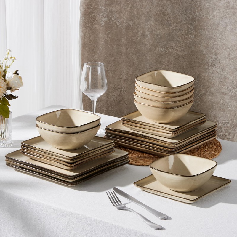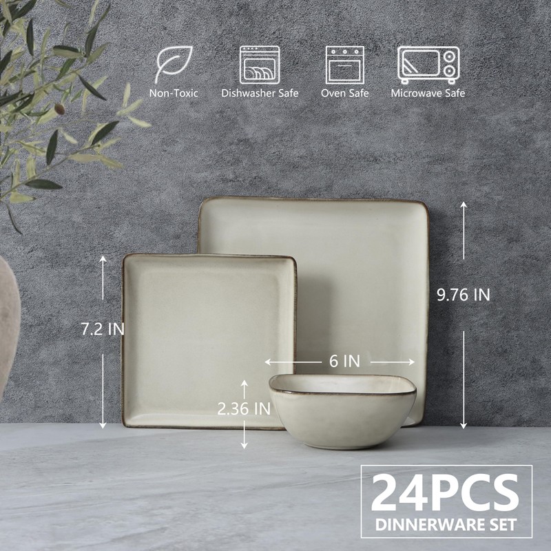 E-far Square Dinnerware Sets for 8, 24-Piece Stoneware Plates and Bowls Dishes Set, Reactive Glaze Porcelain Dishware Sets, Chip & Scratch Resistant, Microwave & Dishwasher Safe, Sandy Beige
