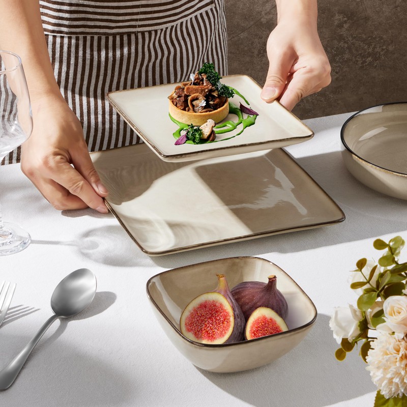 - SQUARE DINNERWARE SETS FOR 8: 8 each of 9.76-inch Dinner Plates, 7.2-inch Salad Plates and 6-inchCereal Bowls(23oz), Includes everything for big families, Soft square design matches any kitchen dining style, Perfect for casual meals, entertaining guests, or as a wedding, housewarming or Christmas gift