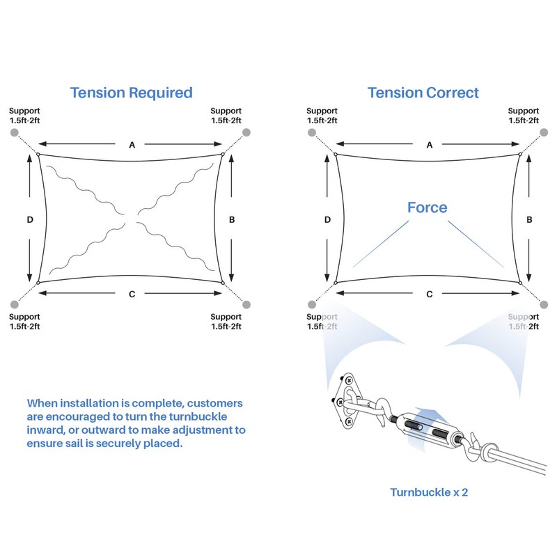 - EASY TO INSTALL WITH HARDWARE KIT - With D-Ring on each corner, our sun shade sail will strongly guarantee fastness of installation. Curved sides will ehance pull strength. Our sun shade sail is easy to install, you need to leave 1.5-2 ft space for the hardware kit between D-Ring and fixing points (Hardware Kit Included).