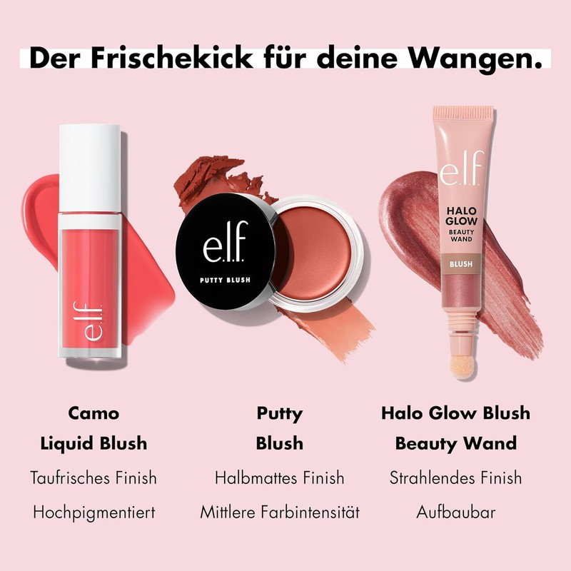 - Highly pigmented liquid rouge: create and blend a dewy splash of colour with e.l.f. Cosmetics Camo Liquid Blush. The pigment-rich formula gives the cheeks a long-lasting red tone that is as flattering as e.l.f.