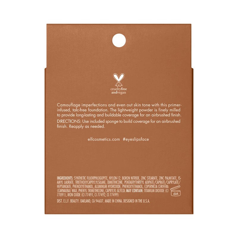 - FOR ALL SKIN TYPES: A great addition to your makeup routine for all skin types, especially those with oil control concerns. Camo Powder Foundation is talc-free and non-comedogenic. Pairs well with the entire e.l.f. Cosmetics Camo collection.
