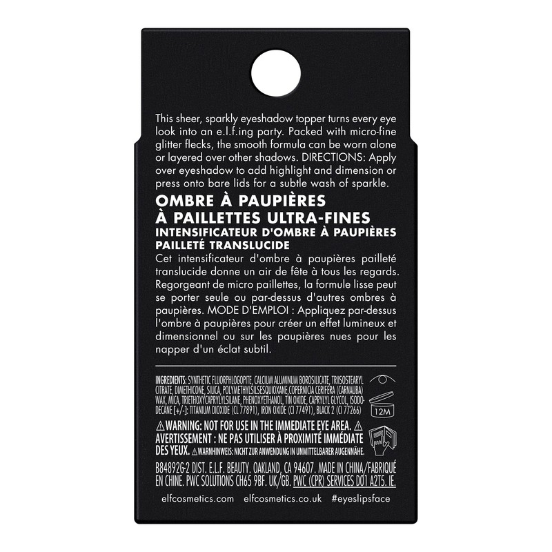 What it is: Turn every eye look into a party with e.l.f. Cosmetics Fine as Fleck Glitter Eyeshadow! This sheer, dazzling eyeshadow topper is packed with micro-fine glitter flecks to play up your eyes with a mesmerizing wash of sparkle.Why you'll love it:Long-lasting sheer glitter eyeshadow topper with a shimmer finishPacked with micro-fine glitter flecks for an eye-catching, party-ready vibeSoft, smooth formula without the gritCan be worn alone or layered on top of your go-to e.l.f. eyeshadowsIngredients may change or vary from time to time. Please refer to the packaging of the product received for the list of ingredients in your particular product. All e.l.f. products are proud to be 100% vegan, cruelty-free, and Leaping Bunny Certified. Because kindness is chic.
