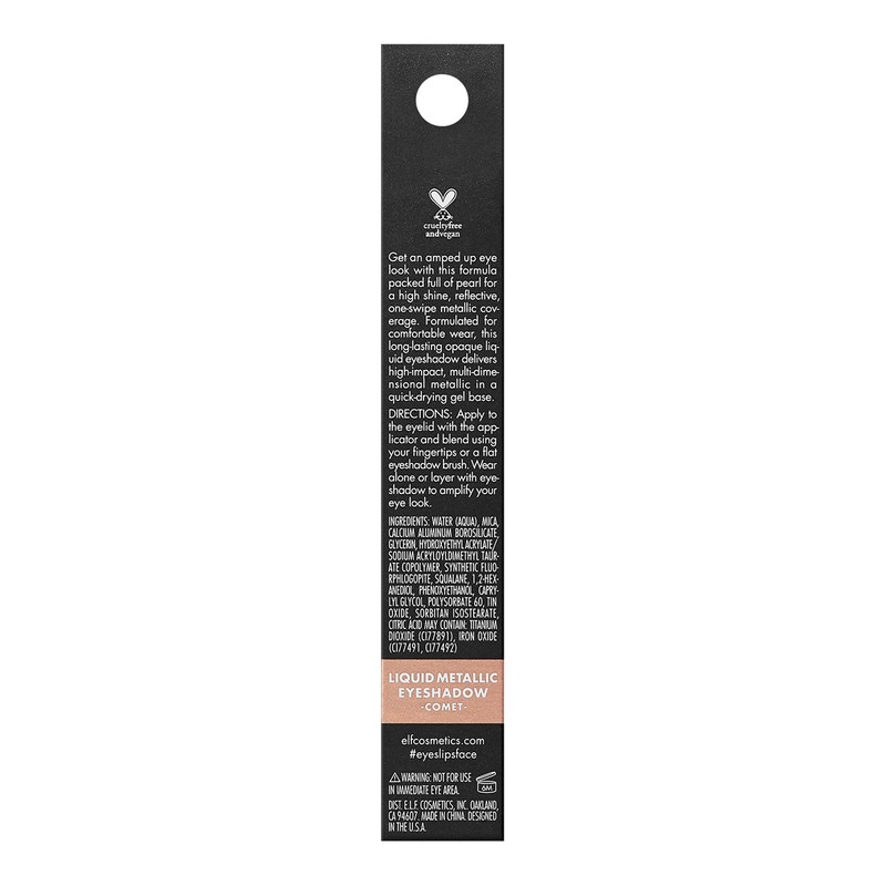 • AMPED UP EYE LOOK: Get an amped up eye look with e.l.f. Liquid Metallic Eyeshadow! This liquid eyeshadow delivers a high-impact, metallic finish through multi-dimensional metallic pearls. The shade Comet is rose gold with cool silver shimmer.