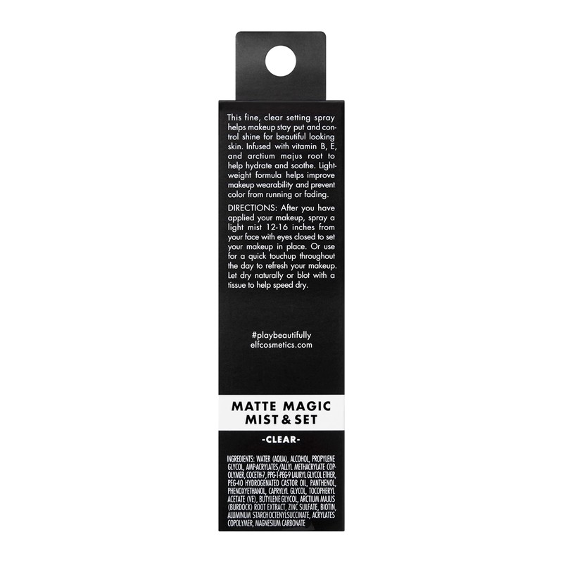 Ready, set, flawless makeup and skin. This fine, clear makeup setting mist helps lock your look into place for a beautiful matte finish that lasts. After applying makeup, mist the lightweight formula over your face to keep your makeup from running or fading, control shine, and refresh your look throughout the day. Plus, it's infused with skin-loving vitamins B & E plus Arctium Majus Root to deliver hydrating and soothing benefits for healthy-looking skin.