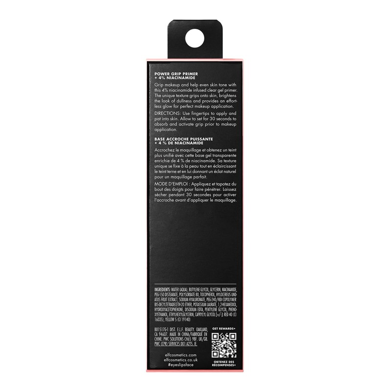 Your skins future looks brightyour favorite sticky AF Power Grip Primer is now infused with skin-loving niacinamide to help even out skin tone and brighten while gripping your makeup. This gel-based formula preps and primes your complexion for makeup application while smoothing and brightening the look of dullness. Ideal for all skin tones, it goes on completely clear and creates a dewy finish. All e.l.f. products are free from phthalates, parabens, nonylphenol ethoxylates, triclosan and triclocarban. Proud to be 100% vegan, cruelty-free, and Leaping Bunny Certified. Because kindness is chic.