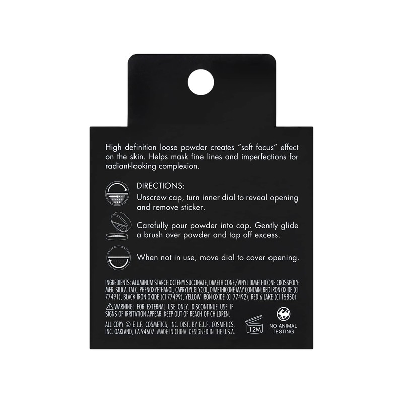 "The High Definition Powder is your secret weapon to a flawless face. This versatile loose powder can be worn to set your makeup or worn alone to reduce shine on days when you feel like going au natural – either way you’ll be putting your best face forward. e.l.f. makes the best of beauty accessible to every eye, lip, and face. Your originality is infinite, and we are inspired by what makes you unique. From the early explorer to the trend-obsessed beauty junkie—glam or bare faced, minimalist, maximalist and every look in between—we are for every eye, lip, and face. Proud to be 100% vegan and cruelty-free, worldwide.