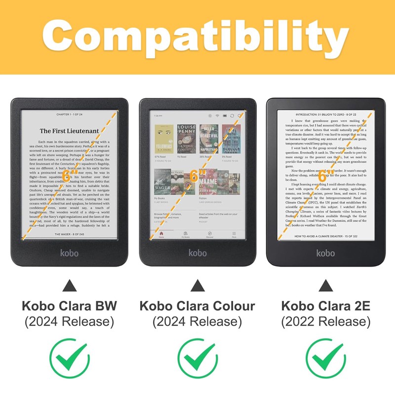 - Compatibility: Specially designed for 6 inch Kobo Clara BW (2024) model N365, Kobo Clara Colour (2024) model N367 and Kobo Clara 2E (2022). Does not fit any other Kobo tablet.
