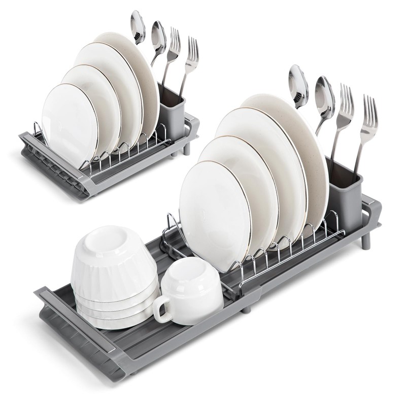 E-ROOM TREND Extendable Dish Drying Rack, Small Dish Rack, Compact Dish Drainer, Dish Racks for Kitchen Counter, Stainless Steel Dish Drying Rack with Removable Cutlery Holder, Grey(DR403G)