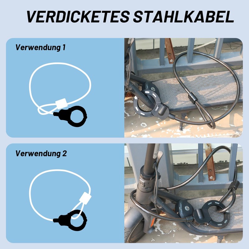- Protects your vehicle: This e-scooter lock is made of high-quality steel and silicone. It is abrasion resistant, durable as well as resistant to oxidation and rust. The soft silicone coating reliably protects the paint of your e-scooter, e-bike, bicycle or motorcycle from scratches and damage when connected.