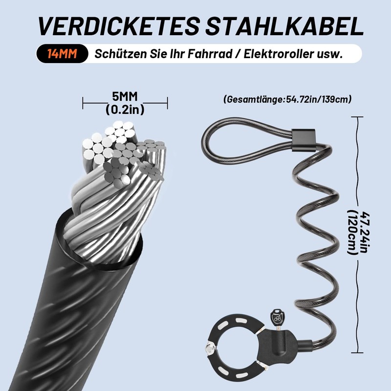 - Thicker cable: 14mm thick - thicker and safer than conventional steel cable locks. The high quality steel cable provides protection against standard tools such as scissors or pliers.