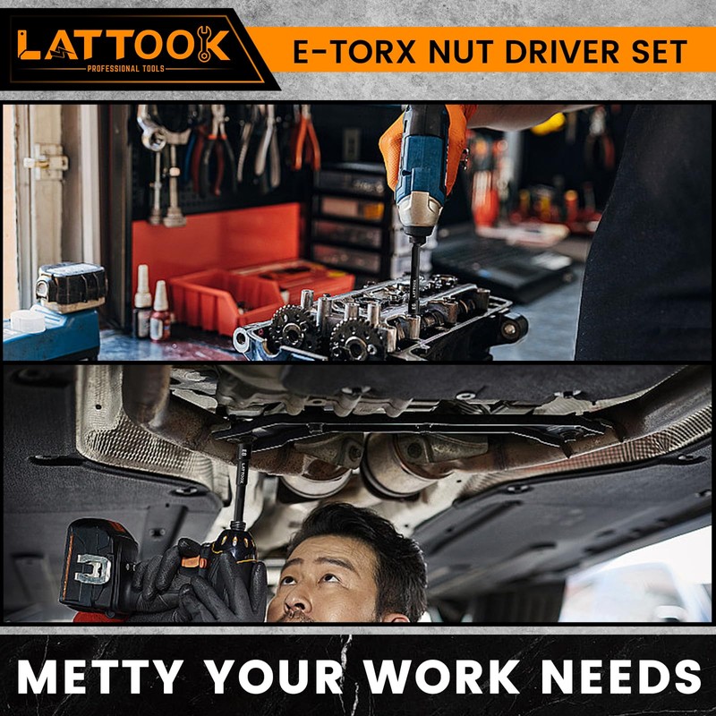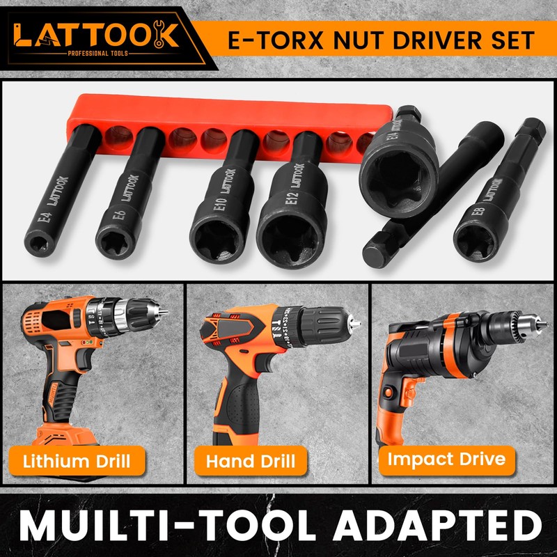 E-TORX Nut Driver Set, LATTOOK 7-Piece 1/4'' Hex Shank Female Torx Nut Driver E Torx & Star Nut Driver External Star Nut Driver Set for Impact Drill, E4 E5 E6 E8 E10 E12 E14