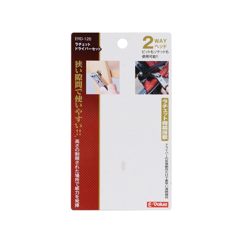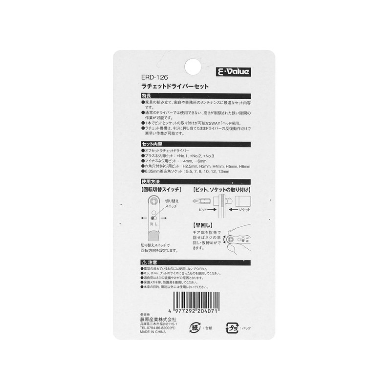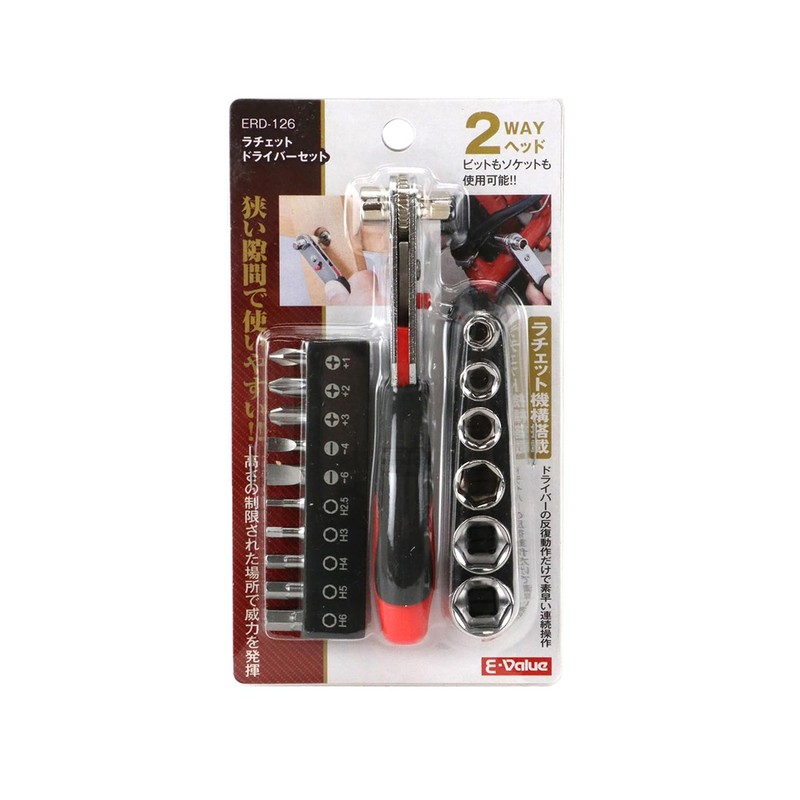 E-Value ERD-126 Ratchet Screwdriver Set, 2-Way Head for Narrow Locations, Allows Bits and Sockets to be Attached, Equipped with Ratchet Function