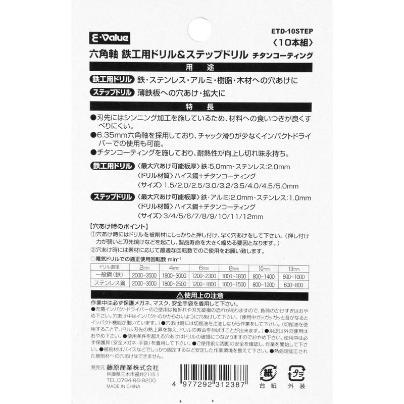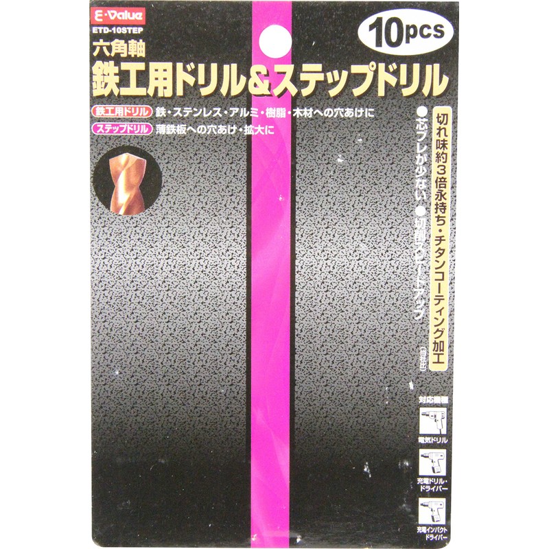 E-Value ETD-10STEP Hexagonal Shaft Iron Drill & Step Drill Set, Titanium Coating, Set of 10