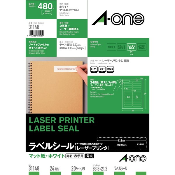 e-wan (A – One) Label Seal [Laser Printer] Matte Paper White A4 24 Surface Four Sides margin with Beveled