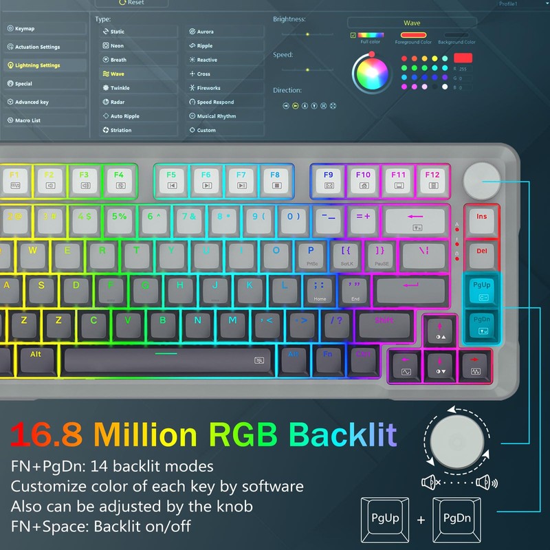 - Adjustable Hall Effect Magnetic Switches ── The entire keyboard is equipped with fully adjustable switches, enabling you to set every key's actuation point from a light 0.1mm to a strong 4mm in 0.1mm steps, putting you in control for fast keypresses or ultra-accurate typing.