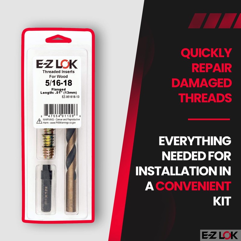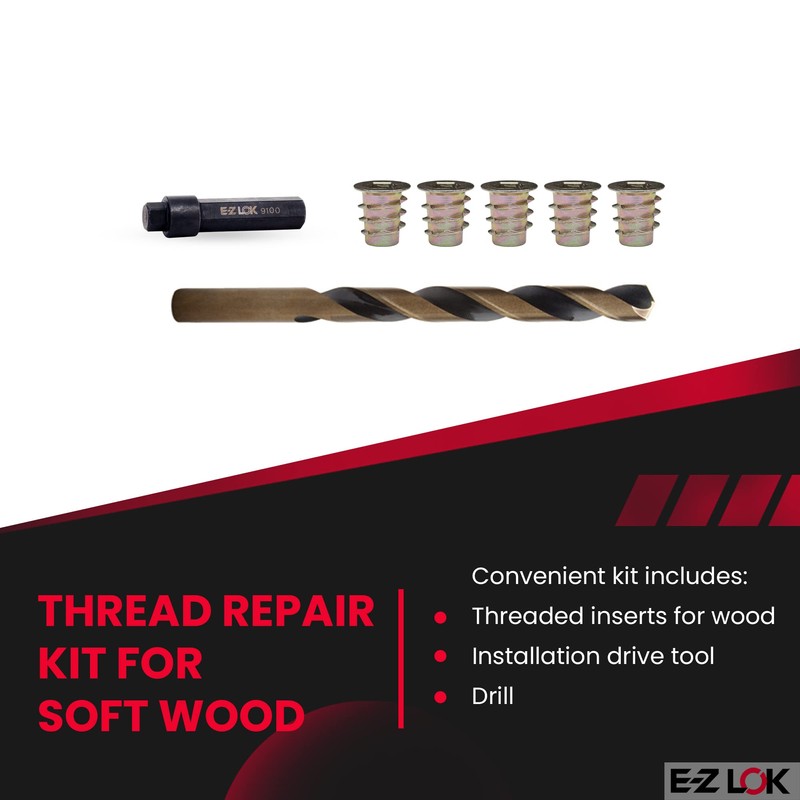 • THREAD INSERT REPAIR KIT – E-Z LOK Thread Repair Kit to repair threaded inserts in soft wood.
