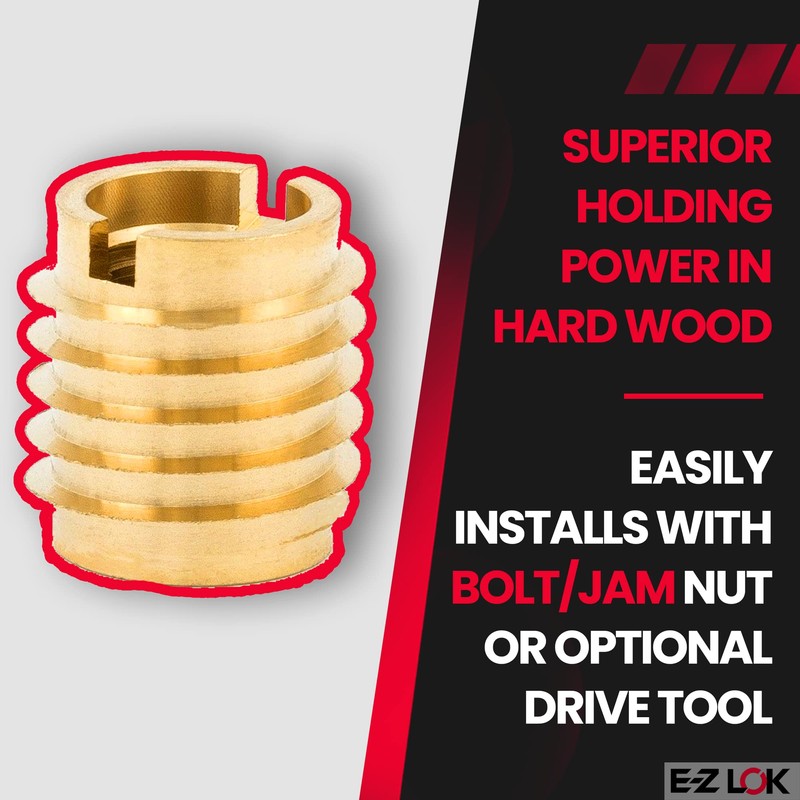 E-Z LOK Knife Thread inserts for hard wood significantly reduce the possibility of stripping when using a threaded fasteners in materials such as oak, cherry, and maple. Ideal for applications ranging from furniture to cabinetry to tap handles, E-Z LOK Knife Threads are easily installed using a bolt and jam nut or optional drive tool. Simply drill the appropriately sized hole and thread in the insert like an ordinary fastener. Proprietary external Knife Threads slice into hard wood, providing holding power superior to that of typical broad threads which crush wood during installation.