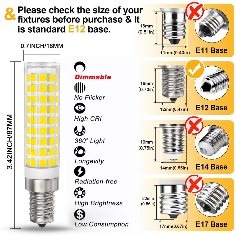 - Dimmable & No-Flicker: E12 dimmable led bulbs, seamless dimming capability (0% - 100%) suitable for any atmosphere or decoration. Compatiable with most led dimmers, Zero Flickering, protect your eyes and care your family.
