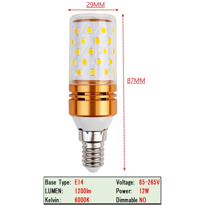 - *(Pack of 2)12W LED Candelabra bulbs. High Quality 60pcs 2835 LED chip. 6000K Daylight White. Not Dimmable. Voltage: AC 200-245V. Power:12W. Replace 100W incandescent bulb by 12W LED. Save over 80% on electricity bill of lighting.