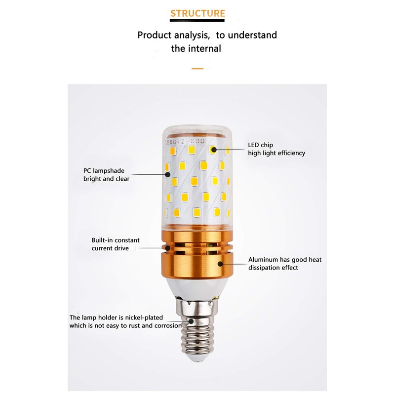 Luminous: 2500LM ( 100Watt Incandescent Bulbs Equivalent ) Base: E14 Beam Angle: 360° Wattage: 12 Watts Voltage: AC185-265V 50/60Hz