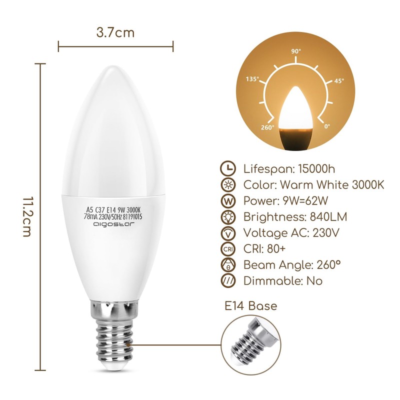 - LED A5 C37 9 Watt Light Bulb Light Output: 720 lumens, large socket E14, white light 6400 K.