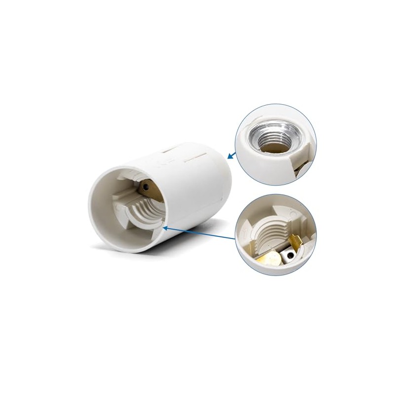 - E14 plastic bulb holder in white, equipped with a convenient spring clamp that makes it easy to install and replace bulbs. Ideal for creating a cosy atmosphere in any room.