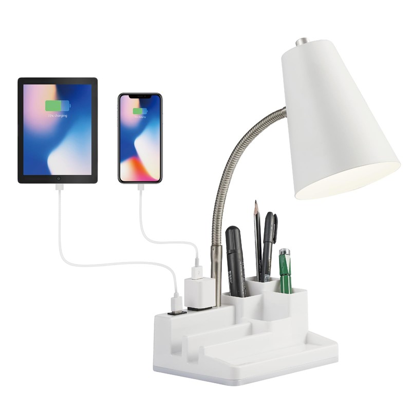 E26 Desk Lamp with 1 USB Charging Port and 1 AC Outlet, Organizer Base, Adjustable Neck, On/Off Switch, Modern Table Lamp for Reading, Working, Studying, Gentle Warm White Light, Eye Protect