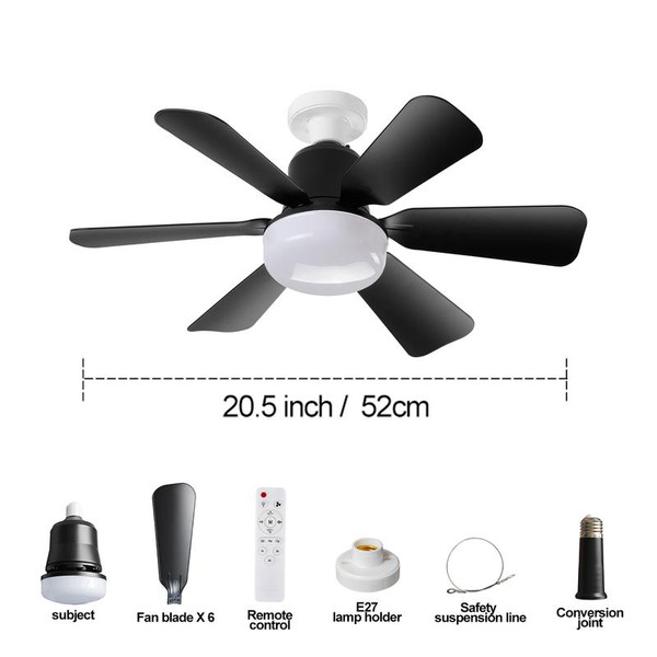 E27 socket ceiling fan light with Safety rope, energy-saving ceiling fan with LED light bulb, strong wind, silent belt memory function, 30W three-speed speed belt remote control, household bedroom kitchen garage dimmable fan light:_Black 1PCS