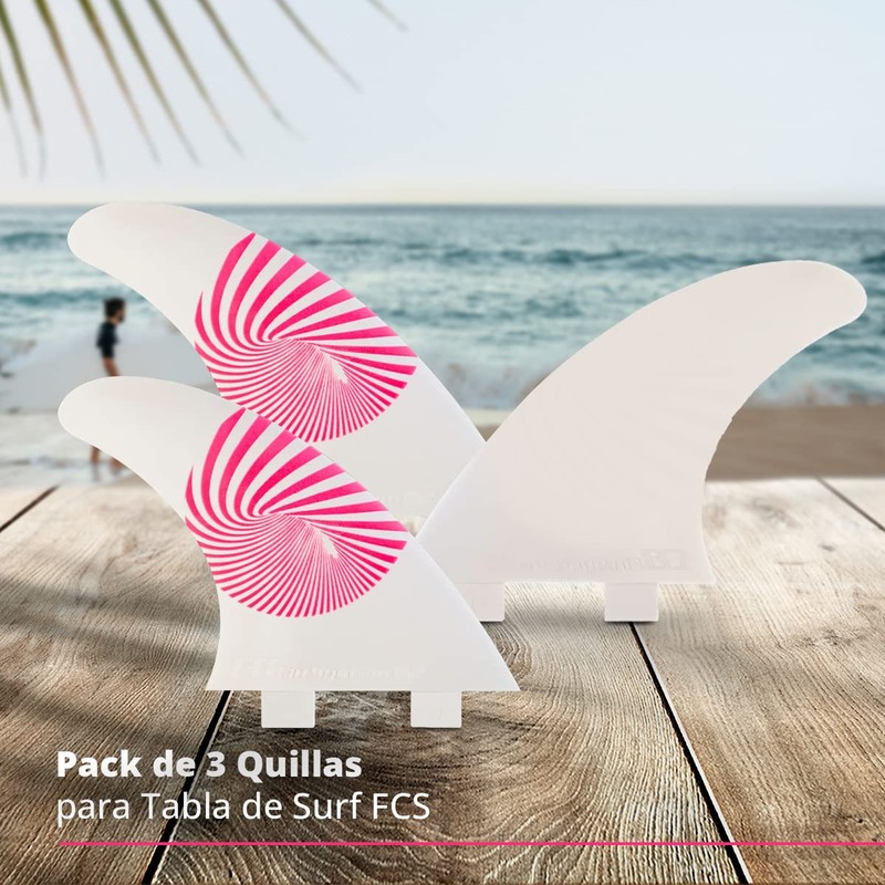 • Surfboard Click This 3 pack surfboard keeps the board focused forward, providing the grip needed to avoid waves and maneuver better when turning. They are compatible with all FCS mounting systems. Box contents: 3 latches (left, right and centre), 1 wrench and bag for storing the keels; weight: 222 g; size L: 75-90 kg; colour: white/pink