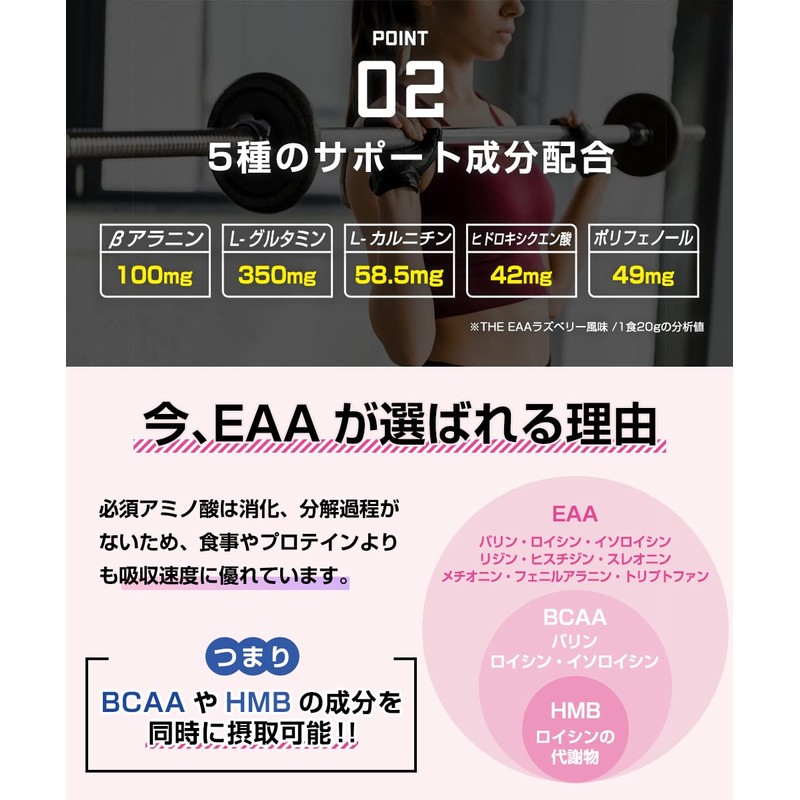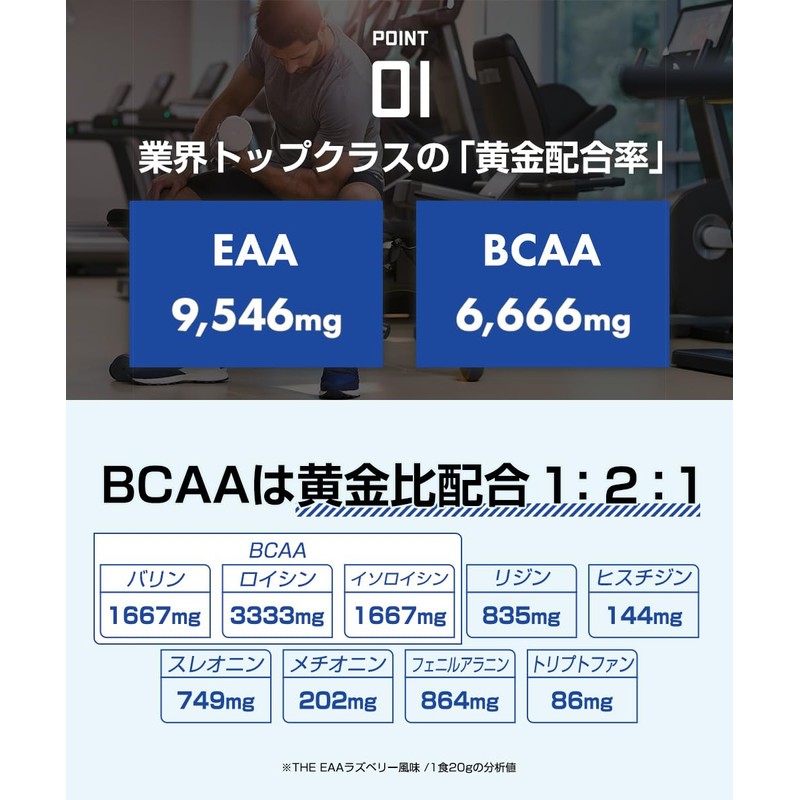 • ⚡【業界トップクラスの黄金配合率】EAA 9,546mg、BCAA 6,666mg配合。バリン、ロイシン、イソロイシンのBCAAは黄金比配合と言われる1:2:1。