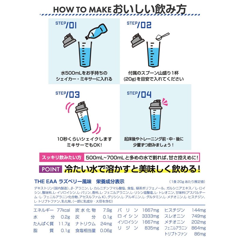 • ⚡【おいしい飲み方】冷たい水で溶かすと美味しい! ①水500mLをシェイカー・ミキサーに入れる ②付属のスプーン山盛り1杯(20g)を目安にEAAを入れる ③10秒くらいシェイク ④起床後やトレーニング前・中・後に少量ずつ飲む