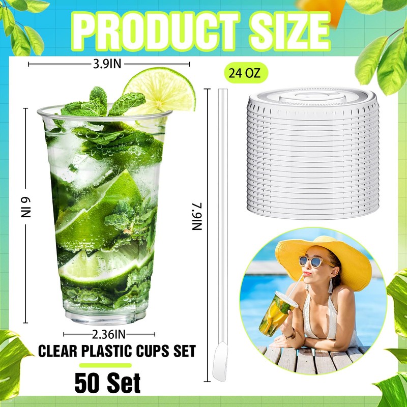 • Clear and Durable Material: our 24 oz clear plastic cups are made of durable PET plastic, safe for drinks and fruits; Enjoy your favorite drinks without worrying about leaks or spills; But please note: avoid using them for hot drinks; If you think the straws are too long, you can trim them to a comfortable length